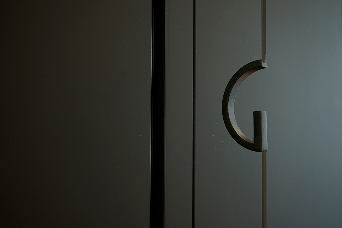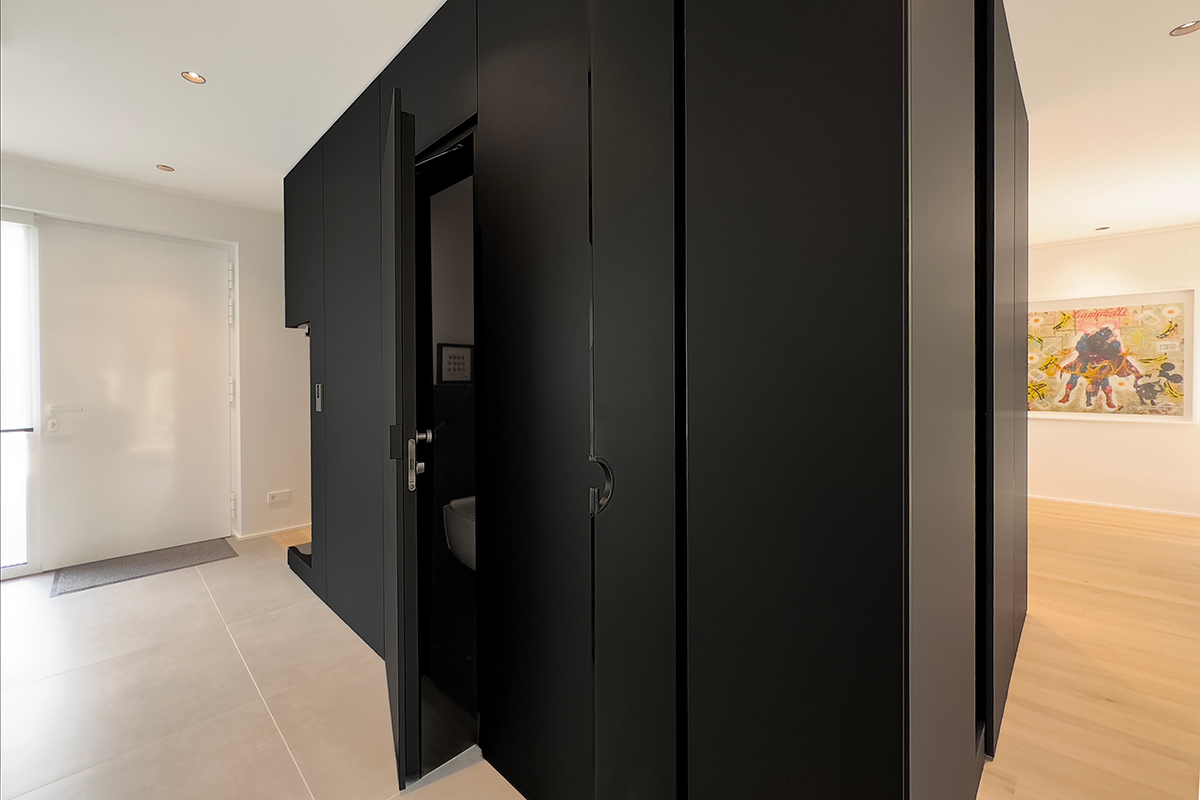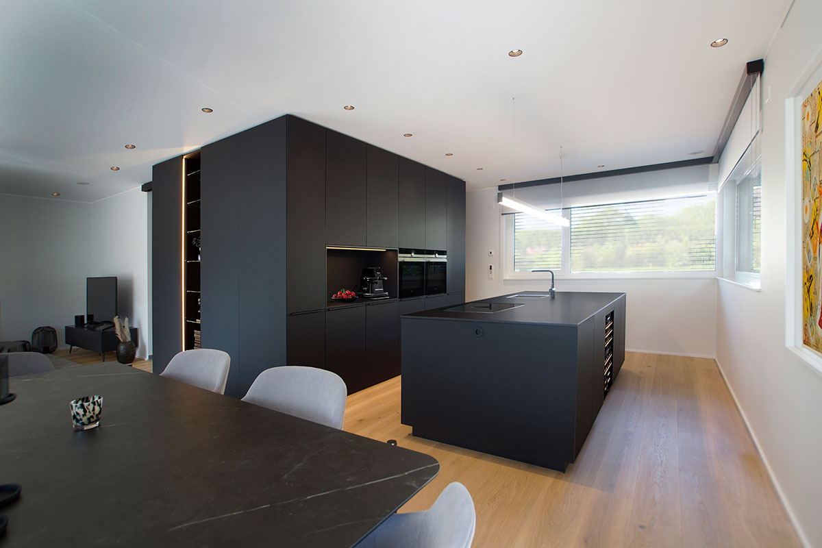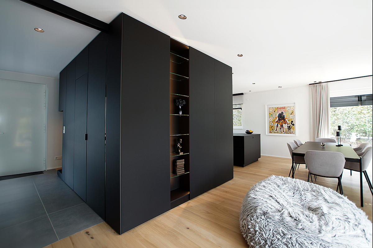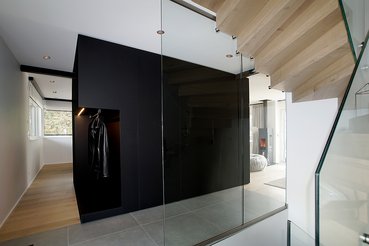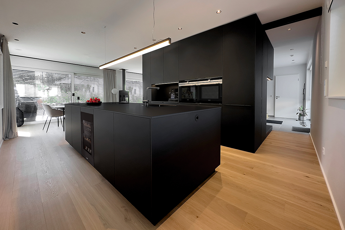 Gestaltet als „Black Box“ und raumhoch ausgeführt strukturiert die Küche den Raum, trennt optisch den Eingang von Ess-, Wohn,- Küchenbereich und verbindet dabei trotzdem gleichzeitig emotional alle Räume. Den einladenden Anfang macht der beleuchtete Garderoben-Ausschnitt. Die Hochschränke im Küchenbereich mit integrierter Einbaunische dienen u. a. zur Unterbringung der gewünschten Haushaltsgeräte.